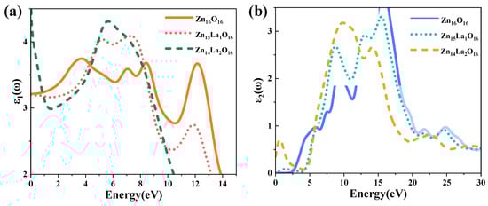 The size of the dielectric constant indicates the capacity of the medium to bind charges. The larger the dielectric constant is, the stronger the capacity of the medium to bind charges is. On the contrary, it means that the binding capacity is weaker [48]. The real part of the dielectric function represents the change in the dielectric constant with the change in photoelectron energy [49], and the imaginary part of the dielectric function reflects the information between the energy band structure and the optical transition. Figure 5 shows the dielectric function curve of the intrinsic ZnO and La-doped ZnO systems. The photoelectron lifetime on the conduction band is proportional to the dielectric constant of the photocatalyst. Therefore, the larger the of the system, the larger the , that is, the longer the photoelectron lifetime on the conduction band [11]. Figure 5a shows the real part curve of the dielectric function. It can be seen from the analysis that the average static dielectric constant of Zn16O16 is 3.21, and the average static dielectric constant of Zn15La1O16 and Zn14La2O16 is 3.21 and 4.66, respectively. With the increase in the La doping concentration, the dielectric constant of the doped system becomes larger, indicating that La enhances the polarization of the doped system and has strong binding capacity to electrons, that is, it extends the photoelectron lifetime on the conduction band of the doped system and brings good conductivity.