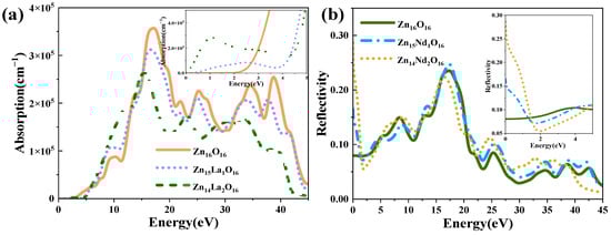 Figure 6 shows the absorption spectrum and reflection spectrum of the intrinsic ZnO and La-doped ZnO system. Optical absorption is one of the most essential optical properties of ZnO semiconductor materials, reflecting the luminescence mechanism of the spectrum generated by the electronic transition between energy levels. The absorption spectrum calculated according to Formulas (1)–(7) is shown in Figure 6a, with an absorption coefficient of 105 cm−1. Analysis shows that the intensity of the first peak of the doped system is not high, and is generally located in the lower energy range. It is generated due to the electrons that absorb energy and transition from the top of the valence band to the conduction band. Though not obvious, the first peak is crucial. The optical absorption edge of the intrinsic ZnO is around 3.30 eV. The absorption edge is where intrinsic absorption begins to appear and intrinsic absorption determines the key optical properties of ZnO. With the increase in photon energy, the absorption coefficient increases sharply in the order of 105 and strong light absorption occurs, indicating that the direct transition begins. In the visible light region (1.64 eV~3.19 eV), the light absorption edge of Zn15La1O16 and Zn14La2O16 moves towards the direction of high energy, which causes a blue shift. The widening of the optical bandgap Eg because of La atoms introduce a large number of carriers (electrons) as donor atoms, Fermi levels enter the conduction band, resulting in the Burstein–Moss effect. This maximal widening is almost equal to the reported value 0.38 eV resulted from La doping of 0.14 at.%, and larger than the reported value 0.2 and 0.13 eV resulted from La doping of 0.3–0.57 at.% [24]. The optical absorption spectra of Zn15La1O16 and Zn14La2O16 show a smaller new absorption peak near 1.06 eV, which is caused by the in-band transition of La-5d orbit. In the visible light region, compared with the intrinsic ZnO, as the doping concentration of La increases, the absorption spectrum moves to the direction of high energy, resulting in a blue shift, and decreased light absorption intensity. The main absorption peak of Zn16O16 is at 16.96 eV, the main absorption peak of Zn15La1O16 is at 16.60 eV, and the main absorption peak of Zn14La2O16 is at 15.38 eV, which is in the vacuum ultraviolet region. With the increase in La doping concentration, the absorption peak moves to the direction of low energy, resulting in a red shift and a decreased intensity of the main absorption peak. As the doping of La introduces new impurity energy levels, a new emission center is developed, leading to the red shift of ultraviolet emission. These results are the same as the reported conclusion that the light absorption of the films in UV range first blue-shift and then red-shift with the increase in the La content (0.5–2.0 at.%) [30]. The absorption peak mainly comes from the transition of excited state electrons from the valence band to the conduction band. The weakening of the absorption peak intensity indicates that the transition process of electrons in this excited state is reduced after La doping. In addition, the absorption peaks near 25.35 eV, 34.58 eV, and 38.86 eV are red-shifted and weaker than Zn16O16. Therefore, the optical properties of La-doped ZnO become worse in the visible light range, but the light absorption in the ultraviolet region is good, so it can be used as a short wave device.