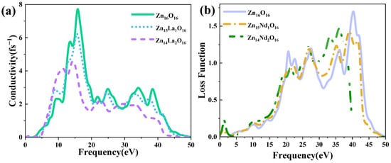 The energy loss function describes the energy loss of electrons passing through a homogeneous crystal, and its peak value is related to the plasma frequency. Based on calculations with Formulas (1)–(8), the energy loss function reflects the energy loss when photons pass through the crystal. Figure 7b is the energy loss function of the intrinsic ZnO and La-doped ZnO systems. Analysis shows that the plasma frequency of Zn16O16 is 40.29 eV, the plasma frequency of Zn15La1O16 is 38.79 eV, and the plasma frequency of Zn14La2O16 is 18.57 eV. With the increase in the La doping amount, the peak value is red-shifted, and the intensity is always weaker than the intrinsic ZnO system.