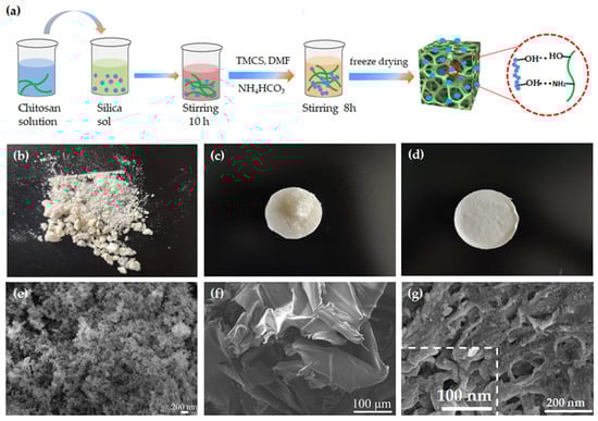 Chitosan was weighed and dissolved in 0.1M acetic acid solution, and a certain amount of DMF was added to obtain 1 wt% chitosan solution. A certain amount of sodium silicate was dissolved in water and mixed with EtOH and DMF in a certain ratio to obtain 6 wt% silica sol. CS solution and silica sol were mixed according to a certain proportion, and then a certain amount of ammonium bicarbonate was added to the mixture to make the solution pH neutral. The mixture was stirred continuously for 8 h to allow the solution to react fully. The resulting complexes were freeze-dried to obtain silica–chitosan composite aerogels (SCAs, Figure 1a). The samples were labeled as SCA−1/4, SCA−1/2, SCA−1/1, SCA−2/1 and SCA−4/1 (A/B represents the ratio of the two composites).