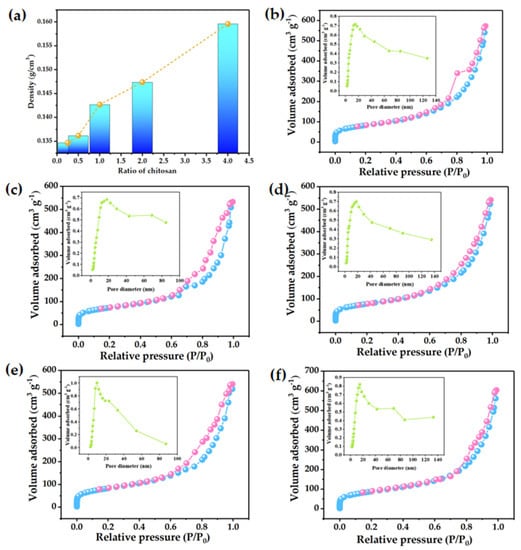 (a) Density change in SCA; (b–f) N2 adsorption–desorption curves and pore size distributions of SCA: (b) SCA−1/4; (c) SCA−1/2; (d) SCA−1/1; (e) SCA−2/1; and (f) SCA−4/1.