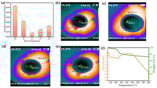 (a) Thermal conductivity of SCAs; (b,c) infrared photos of heat insulation at 50 °C; (c,d) infrared photos of heat insulation at 100 °C; and (e,f) differential thermal analysis and thermogravimetric curves of SCAs.
