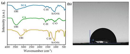 (a) Infrared spectra of SAs, CAs and SCAs; (b) Water contact angle of SCAs.