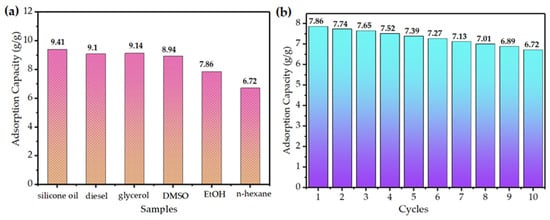 We further investigated the adsorption performance of SCAs on different organic solvents. Considering the viscosity and density of the organic solvents (Table S8), we used silicone oil, diesel oil, hexane, anhydrous ethanol, dimethylsulfoxide and propanetriol for the adsorption tests. It was found that SCAs have a large adsorption capacity for the above solvents and can adsorb organic solvents of 6.7−9.4 g/g (Figure 5a). Moreover, SCAs were tested for cycling efficiency in an anhydrous ethanol solution (Figure 5b). After 10 cycles, it still had a high adsorption efficiency of 6.72 g/g. The SCA adsorption efficiency remained at around 86% compared to the initial adsorption.