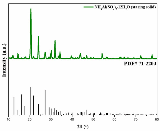 To determine the phase structure of the reactant and products, XRD analysis was used, and the patterns are presented in Figure 1, Figure 2 and Figure 3. As is shown in Figure 1, the XRD patterns of the NH4Al(SO4)2·12H2O (starting solid) reactant corresponded with the standard XRD pattern (PDF No. 71-2203).