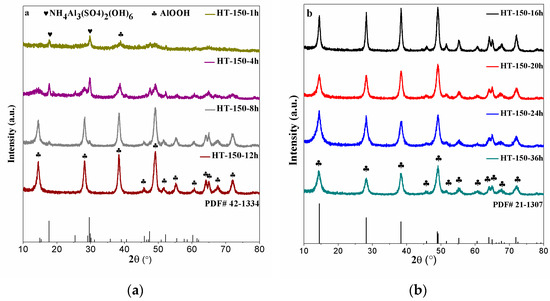The XRD patterns of the hydrothermal samples at 150 °C with different reaction times (1 h, 4 h, 8 h, 12 h, 16 h, 20 h, 24 h, and 36 h) are shown in Figure 2. For the HT-150-1 h sample, only three small peaks at 17.6°, 29.5°, and 38.8° could be observed. The peaks at 17.6° and 29.5° were associated with NH4Al3(SO4)2(OH)6 (PDF No. 42-1334) [19], and the peak at 38.8° was attributed to the characteristic peaks of boehmite (AlOOH) [6]. This indicated that the crystallized product was formed after 1 h with the fundamental amorphous phase. Additionally, there were no obvious diffraction peaks that could be observed; thus, the phase of the HT-150-1 h sample could not be accurately determined. For the HT-150-4 h sample, diffraction peaks at 17.6° and 29.5° could also be observed, and other diffraction peaks with smaller intensities and broader widths could be observed at 14.5°, 28.1°, 38.3°, 48.8°, 51.5°, 55.1°, 60.5°, 63.8°, 64.8°, 67.5°, and 72.1°, which were associated with the crystal structure of boehmite. This indicated that the phase of boehmite formed gradually in the HT-150-4 h sample. When the reaction time reached eight hours, diffraction peaks corresponding to NH4Al3(SO4)2(OH)6 were barely observed, except for the small peaks at 17.6° and 29.5°. Additionally, the remaining peaks belonged to boehmite. With the reaction time extended to twelve hours, the peaks of NH4Al3(SO4)2(OH)6 completely disappeared, and the intensity of the peaks corresponding to boehmite were enhanced, which indicated that good boehmite crystallinity was formed in the HT-150-12 h sample. Between the HT-150-16 h, HT-150-20 h, HT-150-24 h, and HT-150-36 h samples, the XRD patterns showed similar diffraction peaks, as is shown in Figure 2b. All the diffraction peaks corresponding to boehmite (PDF No. 21-1307) were found in the hydrothermal product. Noticeably, diffraction peaks assigned to NH4Al3(SO4)2(OH)6 were observed in the HT-150-1 h and HT-150-4 h samples at 17.6° and 29.5°, which indicated that a decent amount of NH4Al3 (SO4)2(OH)6 could be formed at 150 °C.