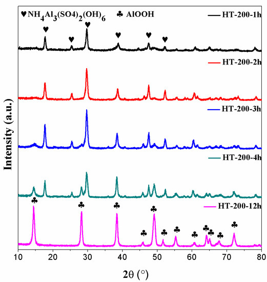 Figure 3 shows the XRD patterns of the hydrothermal samples at 200 °C with different reaction times (1 h, 2 h, 3 h, 4 h, and 12 h). For the HT-200-1 h sample, diffraction peaks around 17.6°, 25.2°, 29.5°, 38.6°, 47.3°, and 51.9° were ascribed to the characteristic reflections of NH4Al3(SO4)2(OH)6 [19]. This indicated that when the hydrothermal temperature reached 200 °C, the reaction product was not alumina hydrate but NH4Al3(SO4)2(OH)6. This was also the first time that the synthesis of NH4Al3(SO4)2(OH)6 occurred under initial alkaline conditions. Noticeably, with prolonged reaction times, the transformation of phases for the hydrothermal sample at 200 °C took place. When the reaction time reached 12 h, the crystallized product was completely transformed into boehmite at a 150 °C reaction temperature. Additionally, the same condition occurred at a 200 °C hydrothermal temperature, where no NH4Al3(SO4)2(OH)6 peak could be observed in the HT-200-12 h sample and diffraction peaks of boehmite with a good crystallinity were observed.