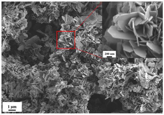 Figure 4 shows the morphology of the HT-150-24 h sample. A large amount of the sheet-like structure, with distinguishable boundaries of boehmite (AlOOH), was observed in the HT-150-24 h sample. Additionally, the rose-like structures were composed of nanosheet building blocks, which were also unstable. It was reported that boehmite crystals prefer to grow into nano-flakes under weak, basic hydrothermal conditions, owing to their distinctly AlO6-octahedral-layered structure, which possesses a great deal of surface-located OH-groups [27,28]. The boehmite samples in the literature exhibit mainly flake-like structures that have a length of approximately 600 nm and a width of around 250 nm [28]. In our research, the boehmite sample exhibited mainly sheet-like morphologies with a length of around 1.6 µm and a width of approximately 0.5 µm. In order to investigate the evolutionary process of the sheet-like structure of the AlOOH crystals, SEM was performed on the whole samples at a hydrothermal temperature of 150 °C. Several representative pictures of this process are shown in Figure 5.