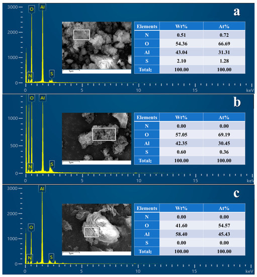 The energy spectra of the HT-150-1 h, HT-150-4 h, and HT-150-16 h samples are presented in Figure 6. For the HT-150-1 h sample, the element wt% values of N, O, Al, and S were 0.51%, 54.36%, 43.04%, and 2.10%, respectively. It was confirmed that the minor quantities of the S and N elements were present in the HT-150-1 h sample, which further validated the little NH4Al3(SO4)2(OH)6 crystals that formed in the HT-150-1 h sample. As the reaction progressed, the element wt% values of the N and S in the HT-150-16 h sample decreased gradually until they reached 0. Furthermore, the element wt% values of the O and Al were 41.60% and 58.4%, respectively. These findings were fully consistent with the XRD results.