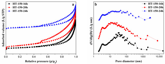 N2 absorption–desorption results of the HT-150-16 h, HT-150-20 h, and HT-150-24 h samples. (a) N2 absorption–desorption isotherm; and (b) pore-size distributions.
