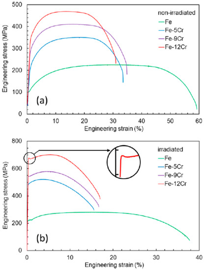 Engineering stress strain curves in iron and iron-chromium alloys in (a) virgin and (b) irradiated state [40]. Post-yield softening and ductility loss are clearly observed in the irradiated case.