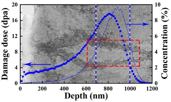 Image showing the damage profile of tungsten implanted with He ions simulated with SRIM software superimposed on TEM image [102].