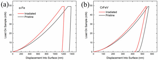 However, in contrast to neutrons, ions are charged, and thus they can penetrate the material to a very shallow depths only; see Figure 5. Since the thin surface of a material cannot be mechanically tested using conventional mechanical testing, typically the instrumented (nano)indentation test (see, e.g., [12,50,51,97,98,99,100,101]) is used in order to obtain the properties of the irradiated layer. As was already mentioned in this review, the basic mechanistic effect of irradiation is irradiation hardening. In terms of load-penetration curves this is visible by means of higher load value at the same displacement in the case of ion implanted material; see Figure 6.