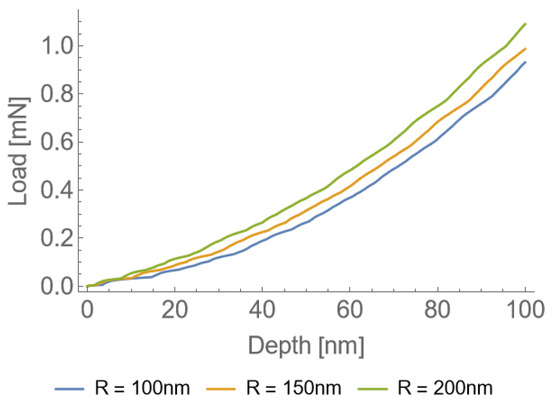 While modelling the indentation of ion-implanted materials using CPFEM, one should be aware of several important effects. First, ideally the plastic zone should not exceed the flat part of dpa before the peak (see Figure 5). Since the plastic zone is 5–10 times larger than the indenter penetration, this results in severe restriction on the maximum penetration depth or necessitates usage of high ion energies (that lead to considerable ion penetration). Alternatively, one can consider variable defect density as it was performed in [111]. Performing nanoindentation at very small depths poses further challenges. First, at small depths, the size effect plays important role and one should use a size-sensitive model, e.g., [108,114,115,116]. Second, in the case of using pyramidal indenters, the influence of tip bluntness considerably affects the obtained mechanical response [117,118,119,120,121], thus necessitating to explicitly account for it. The simulated load-displacement curves using the Berkovich indenter blunted with three parabolic cylinders with different values of tip radius R (details of the CPFEM simulation will be published in another paper of the author soon) are shown in Figure 7. One can see that the influence of tip radius is considerable. As concerns friction, it seems that its effect on load-displacement curves can be neglected for small depths (see Figure 12 in [109]). On the other hand its effect on surface topography appears to be more severe.