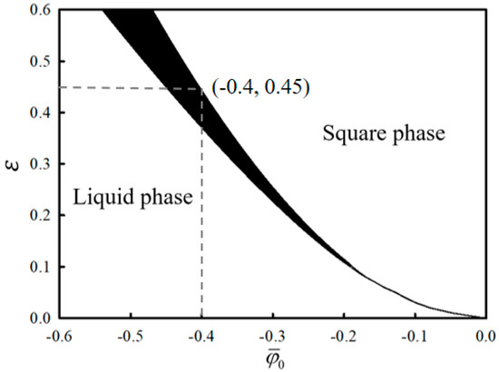 The parameters and are solved by substituting Equation (4) into Equation (1) by minimizing the resulting free-energy F with respect to and . Finally, free energy density for the liquid phase and square solid phase can be expressed as: