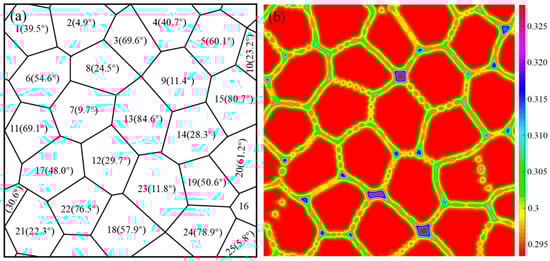 In order to further investigate the micro-deformation mechanism at the atomic scale under applied strain, based on the atomic image of polycrystals, the orientation angle of each grain was measured as shown in Figure 3a, which marked the degree of the orientation angle and the order number.