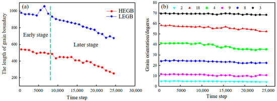 In the later stage, the length of HEGBs and LEGBs decreases almost linearly. Additionally, in this process, the length of HEGBs fluctuates more than that of LEGBs, which may be explained by the fact that HEGBs have higher mobility than LEGBs, but are constrained by surrounding grain boundaries.