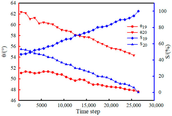 Figure 8 shows the respective area fractions of two grains, which maintain a linear relationship, indicating that dislocation migration is not affected by grain size. As the grain boundary migrates, the grains also rotate at the same time. The rotation directions of the two grains remain consistent, and the orientation difference between grains gradually decreases, and the rotation amplitude of grain 20 is significantly greater than that of grain 19, corresponding with the rotation speed of grain 20 being greater. According to the formula of rotation rate on grain [37]: