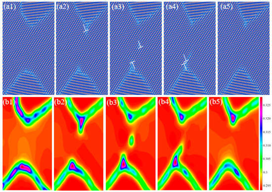 (a) Evolution of atomic configuration image, (b) evolution of free energy image. (a1) t* = 69000, ε = 0.828; (a2) t* = 72000, ε = 0.864; (a3) t* = 73000, ε = 0.876; (a4) t* = 73500, ε = 0.882; (a5) t* = 74000, ε = 0.888. (b1) t* = 69000, ε = 0.828; (b2) t* = 72000, ε = 0.864; (b3) t* = 73000, ε = 0.876; (b4) t* = 73500, ε = 0.882; (b5) t* = 74000, ε = 0.888.