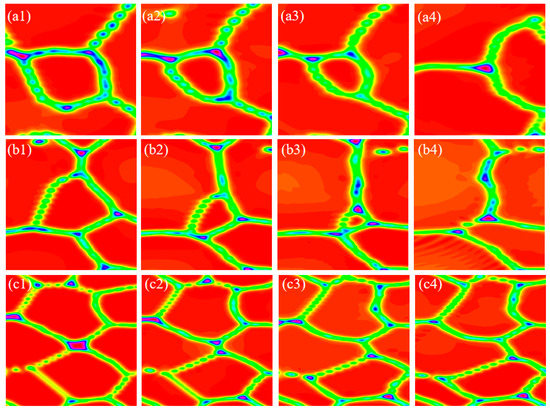 The topological transition of grain boundaries for grain with three sides (a) and four sides (b), as well as that of quadruple crossed grain boundaries (c). (a1) t* = 57,000, ε = 0.684; (a2) t* = 70,000, ε = 0.84; (a3) t* = 75,000, ε = 0.9; (a4) t* = 91,000, ε = 1.092. (b1) t* = 60,000, ε = 0.72; (b2) t* = 79,000, ε = 0.948; (b3) t* = 87,500, ε = 1.05; (b4) t* = 93,500, ε = 1.122. (c1) t* = 500, ε = 6.0 × 10−3; (c2) t* = 9000, ε = 0.108; (c3) t* = 15,000, ε = 0.18; (c4) t* = 17,500, ε = 0.21.