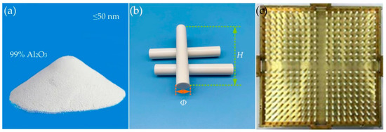 The fabrication of photonic crystal materials is shown in Figure 1. Generally, three steps are required to make alumina powder with high purity of 99 percent into periodic photonic crystal structure, which are shown in Figure 1a, Figure 1b and Figure 1c, respectively. In our previous work, a four-port microwave photonic circulator was proposed and experimentally investigated based on a cross-type PC waveguide [33], which was formed by four tetragonal lattice Al2O3 dielectric rod arrays with a lattice constant of 12 mm, as shown in Figure 1c. The diameter Φ and height H of the Al2O3 dielectric rods are 2 mm and 10.16 mm, respectively. In addition, the Al2O3 dielectric rods also need a great surface finish, as shown in Figure 1b. The 2D magnetic–photonic crystal structure is established by inserting five ferrite posts into the junction of the cross-type PC waveguide [34]. Under an appropriate external dc magnetic field, the microwave photonic circulator obtains an excellent isolation of 30.2 dB at the X-band. In [19], the porous–alumina (PA)-assisted niobia nanostructured films of three types were fabricated through two-step anodizing. The morphology and optical properties in the UV-near-IR frequency range of the films were investigated with the aim of further possible formation of 2D PCs. The third type column-like film (CF) was obtained through the complete removal of PA. To test the applicability of the formed nanostructures as 2D PCs and to evaluate their efficiency, their optical characteristics were numerically simulated, through selecting such appropriate parameters that would make it possible to increase the efficiency of CF as a PC. Thus, as a result of simulating 2D PCs, the optimal parameters of their morphology were determined.