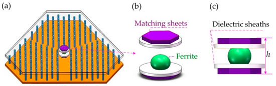 (a) The integral construction of the PC circulator; (b) details of the ferrite sphere and matching sheets; (c) a side view of the dielectric sheaths.