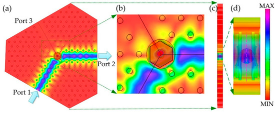 In order to broaden the bandwidth of the circulator, two metal plates are usually introduced into the junction of a waveguide circulator called EMBM [31]. In the previous work [31], two circular aluminum matching plates are introduced into the junction of the circulator to broaden the operating bandwidth. Here, we insert two hexagonal aluminum sheets sandwiching the ferrite sphere to modulate the impedance of our designed PC circulator. To secure the spherical ferrite exactly, two dielectric sheaths (resin material) are placed between the ferrite sphere and the hexagon sheets. It can be seen that the optimal placement and angle of the hexagonal matching sheets are shown in the central detail diagram in Figure 5b. By fine-tuning the angle of the hexagonal sheets, the circulator is working in the optimum state when one of the six sides of the hexagon is perpendicular to the direction of the transmission line. If two circular metal plates are used for impedance matching, as in reference [32], the external performances of the designed circulator cannot be optimized by fine-tuning the angle of the matching plates, like the hexagonal aluminum sheets in this work. A side view of the power distribution for the operating PC circulator is shown in Figure 5c. An interesting phenomenon is discovered, in that the power is evenly distributed in both hemispheres of the ferrite sphere (red dashed line), as shown in Figure 5d.