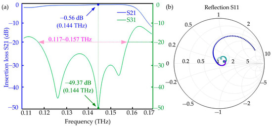 In Figure 6a, the curves of the parameters S21 and S31 change with the frequency. At a resonant frequency of 0.144 THz, the lowest insertion loss (S21) is 0.56 dB and the highest isolation (S31) is 49.37 dB, which is better than that in [32] by using two circular metal plates. It is obvious that our circulator’s bandwidth is assuredly extended to 40 GHz, which covers from 0.117 to 0.157 THz with isolation below −20 dB. The relative bandwidth reaches 29.20%, exceeding the ultra-wideband level of 25%.
