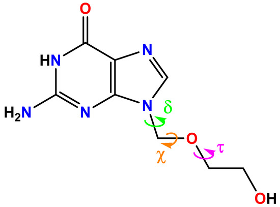 Molecular structure of acyclovir (Acv) showing the torsion angles δ, χ and τ.