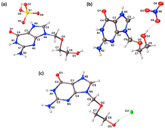 Acyclovir is a guanine derivative and possess amphoteric characteristic, acting as weak acid (pka between 2.16 and 2.27) or base (pKa between 9.04 and 9.25), depending on the system which is present. Three different salts were synthesized, considering the basicity of the purine group, using the following inorganic acids: hydrochloric, nitric, and sulfuric. The asymmetric unit of the salts and the geometric parameters of the hydrogen bonds are shown in Figure 2 and Table 1, respectively, while the hydrogen bonds and bond lengths of Acv and its salts are available in Tables S1 and S2.