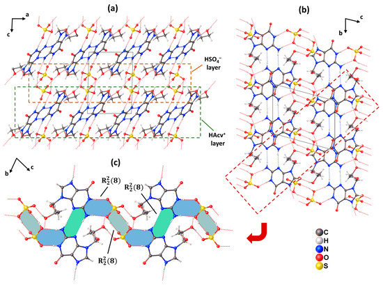 Crystal packing of HAcv·HSO4 (a) through the ac plane (b) viewed through the bc plane (c) Graphic set of the three motifs (8), involving the interaction of Acv+ molecules mediated by HSO4.