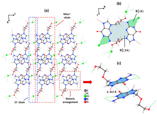 Crystal packing of HAcv·Cl. (a) 2D supramolecular arrangement viewed through the bc plane (b) Graphic set motif (16) and (6) involving the interaction of Acv+ molecules and mediated by Cl− (c) π⋯π interactions forming a dimeric arrangement.