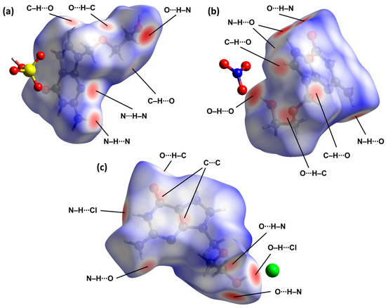 The 2D-fingerprint plots of the salts (Figures S1–S3) clearly show the intermolecular contacts present in the structures. The decomposition of these fingerprints allows the quantification of the contribution of each contact to the crystal packing. The FPs of the synthesized compounds, presented in Figure S7, show that the H⋯H and O⋯H contacts were the major contributors to the crystal packing of these salts. H⋯H comprise 28.9%, 27.0% and 36.7% for HAcv·HSO4, HAcv·NO3; and HAcv·Cl, respectively. Meanwhile, the O⋯H contacts represented 44.8% (HAcv·HSO4), 49.6% (HAcv·NO3), and 27.2% (HAcv·Cl). The H⋯H contribution of HAcv·Cl was higher than the O⋯H one due to the absence of oxygen atoms in its anion (Cl−). An opposite situation was observed for the other two salts. The HAcv·NO3 and HAcv·Cl have more C⋯C and C⋯N contacts contribution than the one observed for HAcv·HSO4. This is due to the presence of the π⋯π stacking interactions in the HAcv·NO3 and HAcv·Cl structures, as verified in the shape index surfaces. The O⋯H contacts are observed in regions of smaller di and de values in the FPs for the three compounds, an indicative that these interactions are shorter and stronger than the other ones.