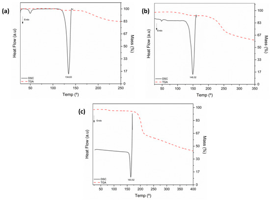 DSC/TGA curves of (a) Acv hydrogen sulfate, (b) Acv hydrochloride and (c) Acv nitrate.