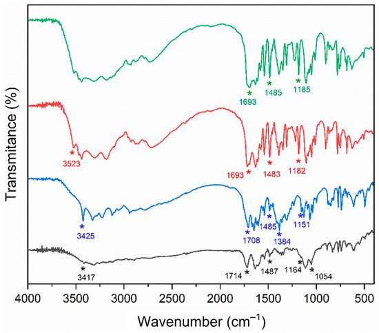 FT-IR spectra of Acv (green) and its salts, HAcv·HSO4 (black), HAcv·NO3 (blue), and HAcv·Cl (red).