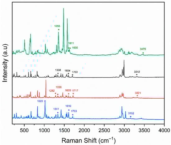 The Raman spectra of Acv and its salts present clear differences that can be attributed to the protonation of the imidazolium group and the vibrational modes arising from the inorganic anions (see Figure 10). The HSO4− and NO3− anions show ν(SO) and ν(NO3) stretching bands at 1020 cm−1 and 1282 cm−1, respectively. As expected, no bands corresponding to the Cl− anion were observed in the Raman spectrum of HAcv·Cl. A new δ(N–H) band was present in the Raman spectra of the salts HAcv·HSO4 (3152 cm−1), HAcv·Cl (3312 cm−1) and HAcv·NO3 (3321 cm−1), which confirms the protonation of the imidazolium ring from Acv.