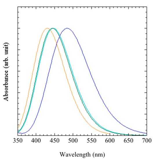 TD-DFT calculated absorption spectra of the luminophore dissolved in toluene (blue), DCM (green), THF (blue), and DMSO (orange).