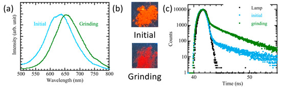 Change in (a) PL spectrum, (b) photoluminescent color, (c) and fluorescent decay profile of the luminophore before and after mechanical grinding.