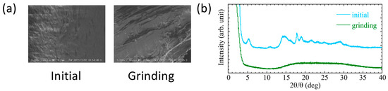 Scanning electron microscopy (SEM) observation of the powder was also performed on the powders. Fibrous structures were observed on the surface of the powder before grinding but not after grinding. Figure 5b shows the powder X-ray diffraction (XRD) results before and after the grinding of the powder. Some peaks were observed in the powder that disappeared after grinding. Compared to previous compounds, the peaks were broad and low in intensity. Therefore, the crystallinity was low and the powder was amorphous after grinding.