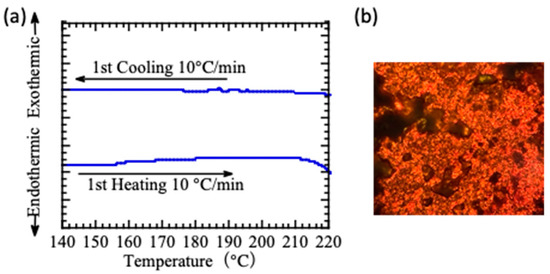 (a) Differential scanning calorimetry thermogram of the luminophore and (b) polarized optical microscopy image of the luminophore at 170 °C.