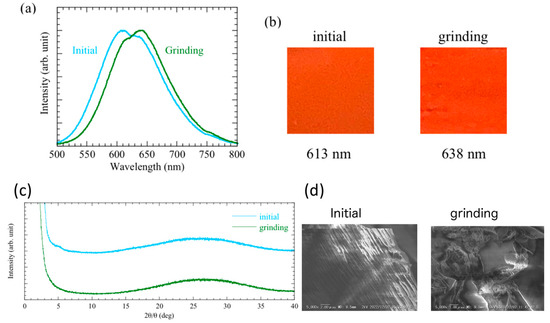 The material that changed color upon gelation retained its luminescent color even after the solvent was removed from the xerogel and exhibited a MC response. The changes in the PL spectra are shown in Figure 8a,b. The XRD patterns showed no diffraction peaks before and after grinding (Figure 8c). From SEM observations, the surface of the ground material showed a pattern similar to that of a fibrous structure before grinding but not after grinding (Figure 8d).