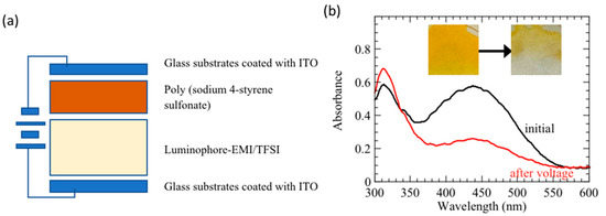 (a) Schematic of the experimental setup and (b) change in absorption spectrum of the luminophore dissolved in EMI/TFSI. The insets in (b) are photographs of the sample before (top) and after (bottom) applying −2 V for 3 min.