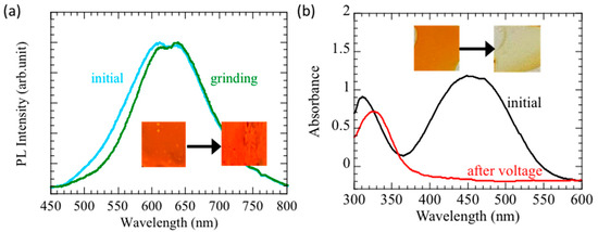 Change in (a) the PL spectrum upon mechanical grinding and (b) the absorption spectrum upon applying −3 V for 3 min of the luminophore-EMI/TFSI-polymer composite. The inset in (a,b) are photographs of the composite under UV light and ambient light, respectively.