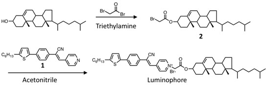 Figure 1 shows the chemical structures of the luminophores used in this study. The synthesis and evaluation methods of the compounds are specifically described in the experimental section. The method of evaluation of the mechanoresponse is a method employed by many research groups. In a previous study, phenylacetylene was introduced at the end of the conjugated backbone; however, thiophene, which has a higher HOMO and smaller energy gap, was introduced in this study. Because cyanostyrobazole linked to thiophene exhibits a friability response even in the protonated state [17], friability is also expected in quaternized compounds. Therefore, to facilitate the expression of the electrical response, we changed the molecular end of the salt to a quaternized pyridine to make it a donor–acceptor salt. The optimized structures were determined using density functional theory (DFT) calculations. Owing to limitations of the computational environment, the thiophene end was assumed to be a methyl group. Frontier orbital plots of the HOMO and LUMO of the optimized structure are shown in Figure 1b,c, respectively; the LUMO was mainly distributed in the acceptor of the cyanostilbene unit, while the HOMO was mainly located in the alkylthiophene unit. The energy levels of HOMO and LUMO are estimated to be 8.05 and 6.13 eV, respectively, with an energy gap between these levels of 1.92 eV. The energy-minimized structures exhibited twisted conformations and improved planarity of the cyanostilobazole moiety compared with the compounds before cholesterol introduction. These electronic structures were similar to those of the protonated cyanostyrobazole derivatives; cholesterol was predicted to be present in a bent conformation at right angles from the conjugated moiety. This is because, in the previous structure, cholesterol was linked to the quaternized cyanostyrobazole via a bromoacetate ester, whereas in the present structure, cholesterol was linked as a benzoate ester, and the linearity was reduced [18].