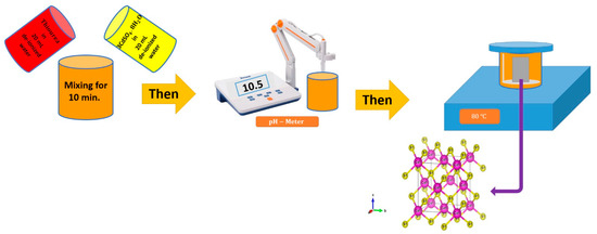 The glass substrates were cut to 2 cm × 2.5 cm for deposition of CdS thin films. To clean the substrates, a detergent solution was used where substrates were rinsed with DIW and then sonicated for 15 min in isopropyl alcohol, acetone, and DIW, followed by drying at 120 °C. A low-cost and low-temperature CBD technique was employed to fabricate CdS thin films on glass substrates. For this, 20 mL of DIW was used to dissolve 0.08 M of (3 CdSO4.8H2O) and 0.2 M of Thiourea in which the two solutions were separately dissolved, as shown in Figure 1. The resulting mixture was agitated for 10 min, adjusted to a pH of 10.5, and then placed in an 80 °C water bath for 30 min.