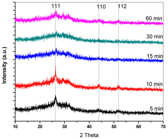X-ray diffraction patterns of the CdS thin films at various deposition times are shown in Figure 3. The peak at 26.60° which corresponds to the (111) plane has the highest intensity, confirming the formation of CdS thin films on the cubic structure (JCPDS # 36-1451 card) [1]. However, the peaks associated with planes (110) and (112) at about 44.4° and 52.0°, respectively, specified that a mixture of hexagonal and cubic phases was formed [2]. The strength of peaks varies with the deposition time, increasing to 10 min and then decreasing. This suggests that the ideal deposition time for maximizing crystallinity is 10 min, as deposition time has a significant impact on the crystallization of the film [3]. Depending on the manufacturing technique, CdS could have either a more stable hexagonal or cubic sphalerite crystal structure [7]. Moreover, Figure 3 shows that the glass substrate is the reason for the enormous hump in the entire set of X-ray diffraction diagrams at the peak at 26.7° [8]. Rietveld refinements of XRD data are attached as a supplementary file.