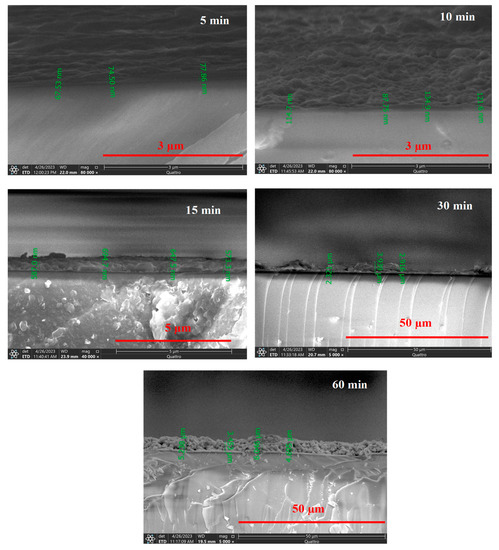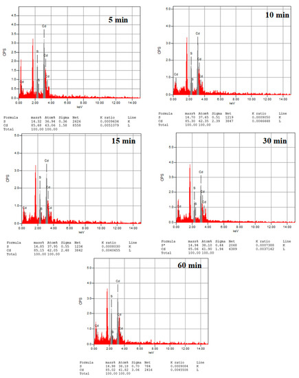 Figure 6 demonstrates a cross-section view of SEM images for the fabricated CdS thin films at different deposition times. It is clear that the thin film thickness increases with increasing deposition time, where it has average values of about 0.073, 0.114, 0.625, 3, and 4.8 µm for deposition times of 5, 10, 15, 30, and 60 min, respectively. Moreover, the roughness is expected to increase with time, as presented for 5 and 10 min. This also could be explained by different growth rates depending on the precursor concentrations where, at shorter times, ion-by-ion growth takes place; however, at longer times, cluster-by-cluster growth takes place [12,33]. Figure 7 shows EDX analysis for the samples where the ratio of Cd and S in the composite is extremely similar, which indicates the formation of the same phase of CdS thin films.