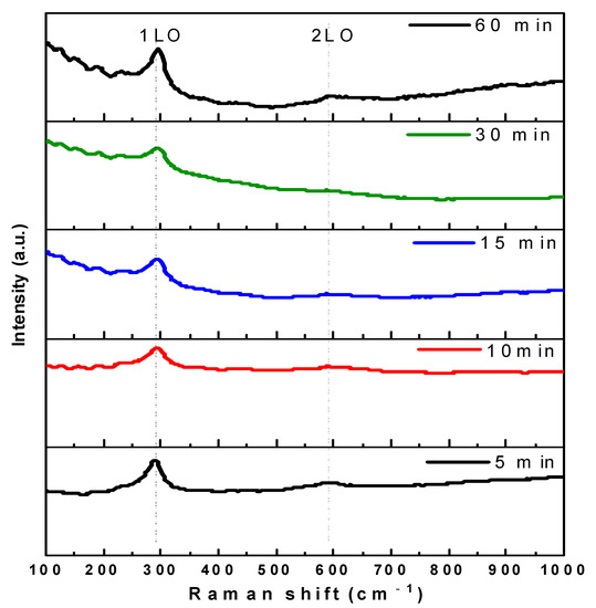 Raman spectroscopy is used to examine the lattice vibrations of generated thin films [13]. Figure 8 displays Raman spectra of CdS thin film at different deposition times. All fabricated thin films have two distinct peaks that are centered at 298 cm−1 and 599 cm−1, indicating principal vibrations modes of CdS thin film. Each peak is the result of the longitudinal optical (1 LO and 2LO) phonons’ first- and second-order scattering [14,15,16]. The ratio of 2LO/1LO intensity has commonly been used to measure the CdS crystallinity in samples [13]. It is significant to observe that, compared to longer deposition times, the 1LO Raman peak intensity is stronger at 5 min of deposition. The size of the crystallites, the effect of surface phonon mode, or the interface stress could all be contributing factors to these differences in peak intensity [17]. This demonstrates the existence of the effect of surface optical phonon mode. The fluctuation in particle size is due to the variation in phonon momentum [18]. In comparison to bulk CdS, a Raman shift in the longitudinal optical phonon vibration frequency between 305–299 cm−1 and 610–599 cm−1 was observed, which agreed well with published results [9,15].