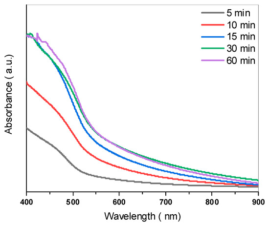 Photographic pictures of the fabricated samples at different growth time as written ( 5, 10, 15, 30, and 60 min).
