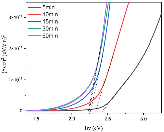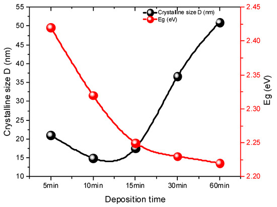 where α is the absorption coefficient, A is a constant, h is Planck’s constant, υ is the frequency, Eg is the band gap, and hν is the energy of the photon. For direct allowed and forbidden transitions, the value of superscript n varies between 2 or 2/3 and 1/2 or 1/3, respectively [5]. The primary absorption edge of Equation (5) exhibits the best linear fit for n = 2, which suggests that there are direct optical band gaps in the thin films. The estimated Eg of the CdS thin films is shown in Table 1, where it decreases with increasing deposition time, falling from 2.4 eV to 2.22 eV for samples deposited for 5 and 60 min. These Eg values were comparable to and well aligned with earlier experimental findings [21]. The lowest Eg value (2.21 eV), which was measured at 60 min, proves that crystallinity improved with increasing deposition time [9]. The CdS thin film thickness increases as the deposition period is prolonged; as a result, the band gap decrease [6] as well as the creation of allowed energy states produce a lower value of Eg, while small particles and grains give a higher value [36]. Figure 11 shows the variation in Eg and nanoparticle crystallite size with changing CdS deposition time. The band gap energy increases with decreasing average crystallite size and rising molar concentration of parent samples because of the quantum confinement effect [23]. Therefore, the transmittance behavior of fabricated CdS thin films is improved in the visible range, and an energy gap of about 2.3 eV supports their suitability for use in solar cell applications.
